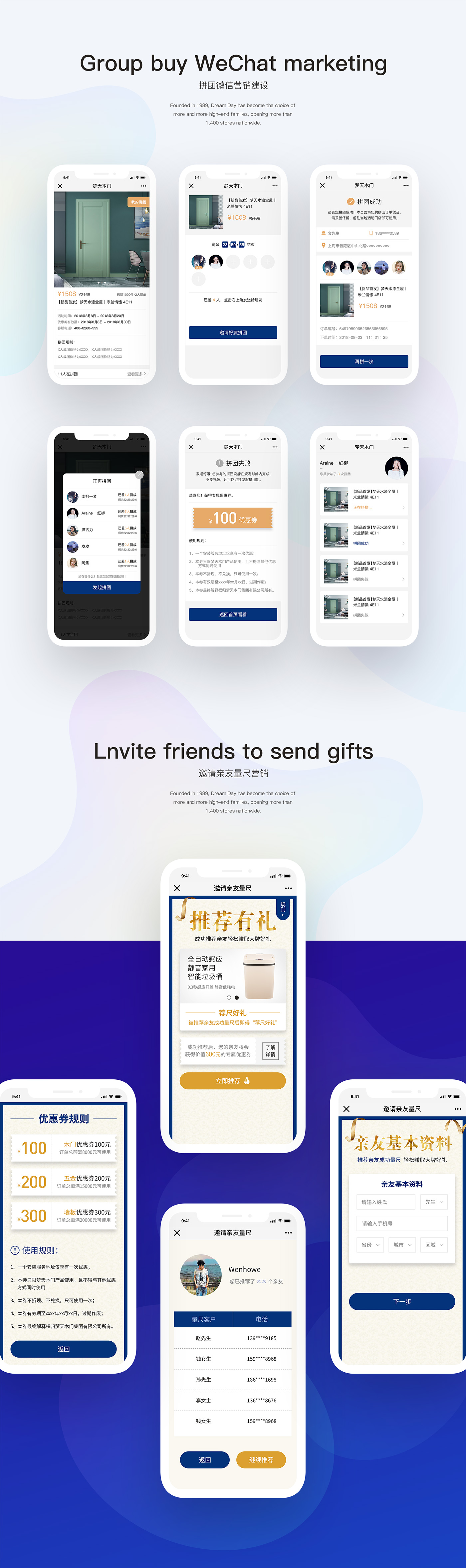 本次助騰為夢天木門提供微信營銷策劃活動,并提供流程原型圖策劃設計、UI界面設計以及程序后臺開發等。頁面不多能實現客戶要求的基本功能,