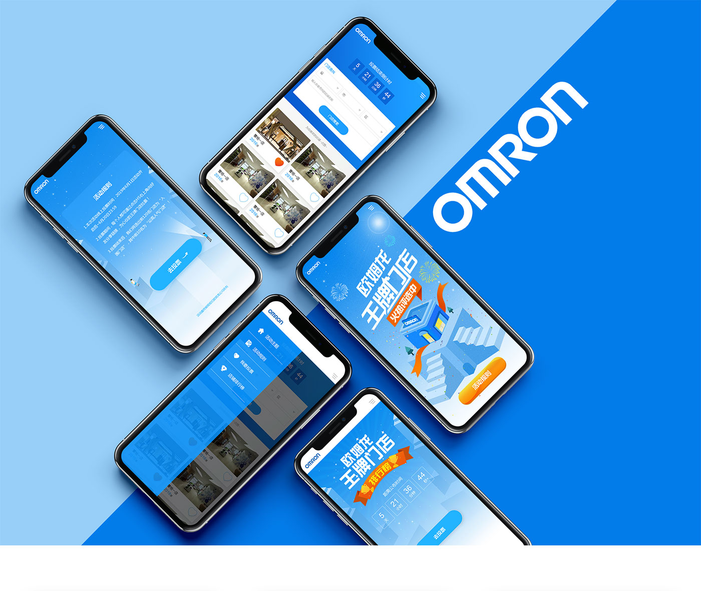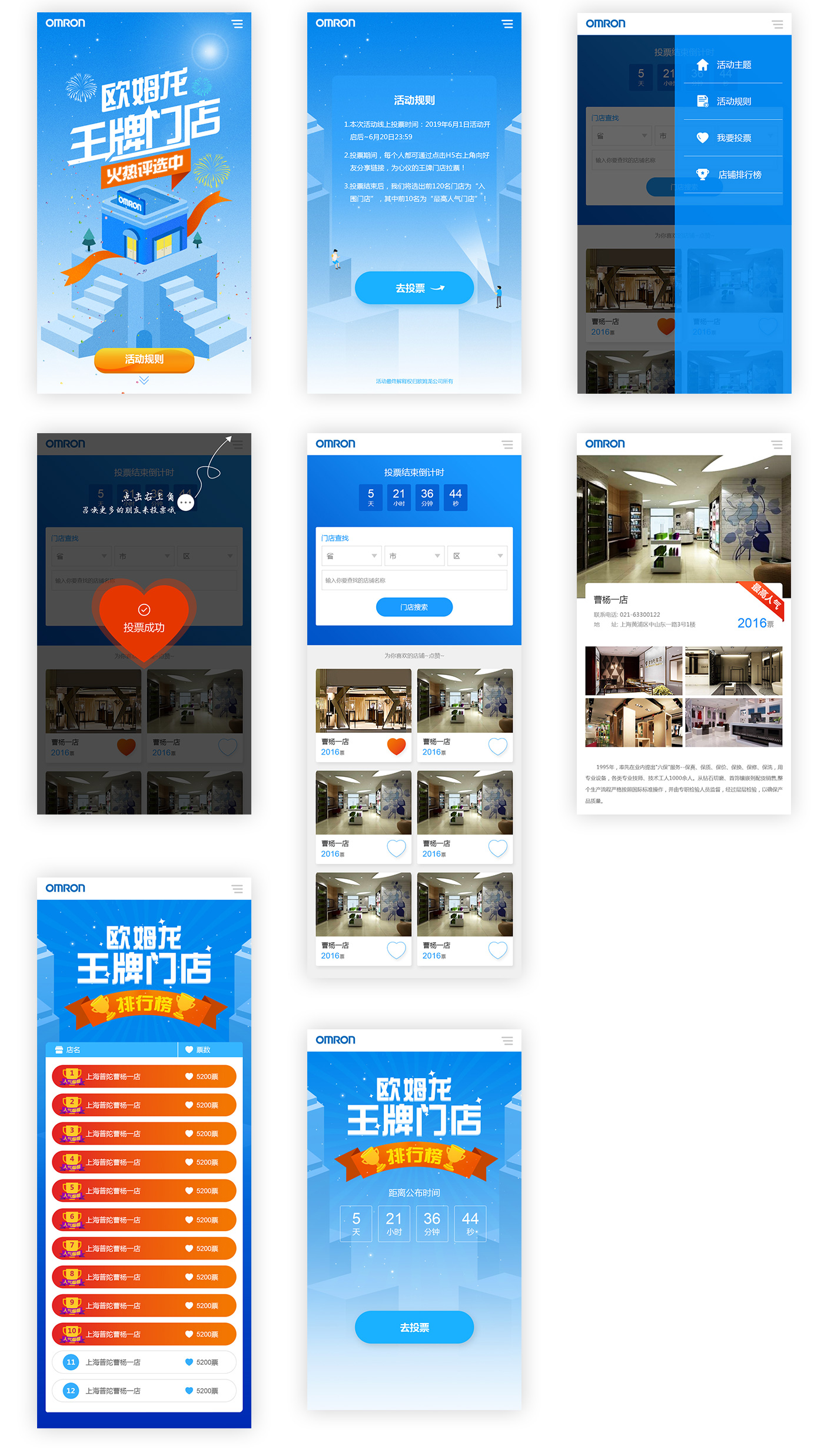 歐姆龍組織的一場王牌店鋪競選。歐姆龍醫療健康設備生產和銷售商。整體活動用品牌藍色為主色調,體現健康,根據活動主題王牌店鋪,設計以舞臺和階梯的形式來體現。
