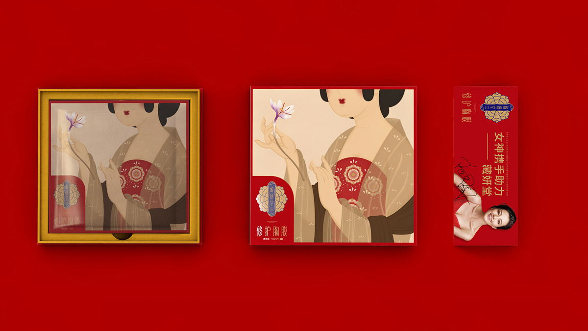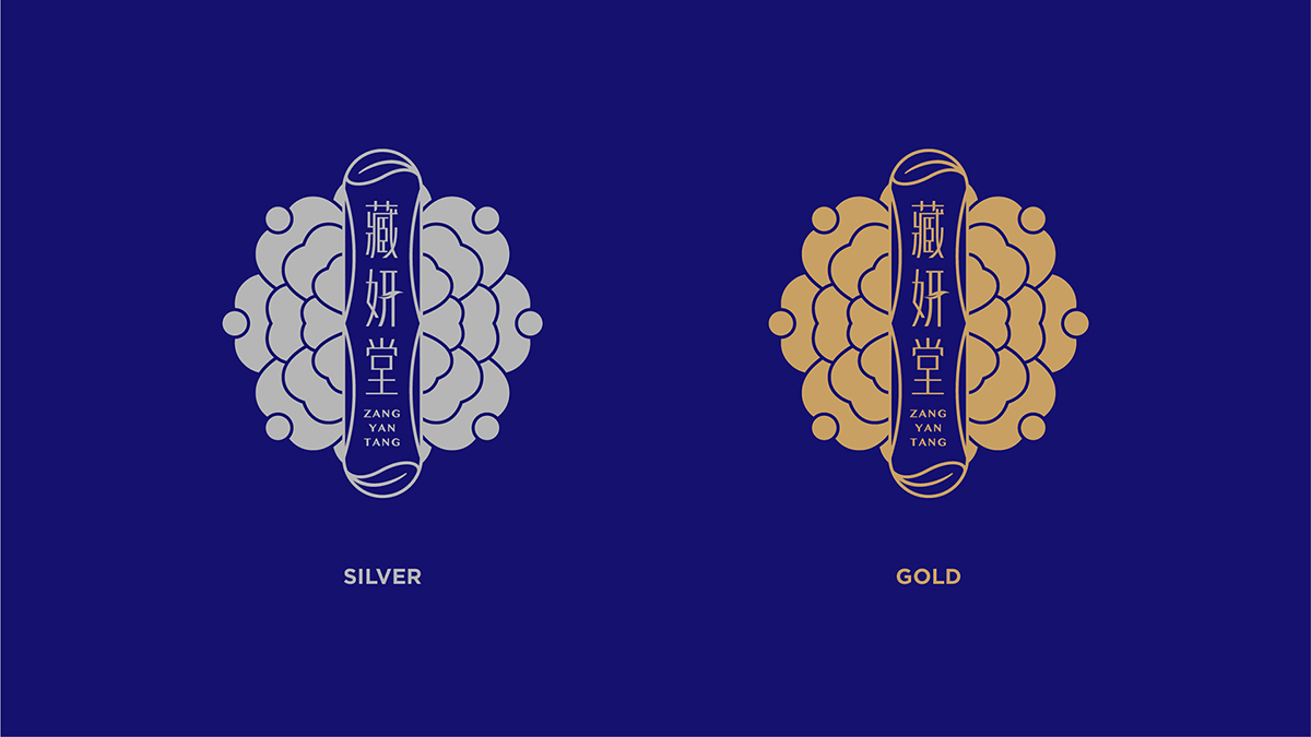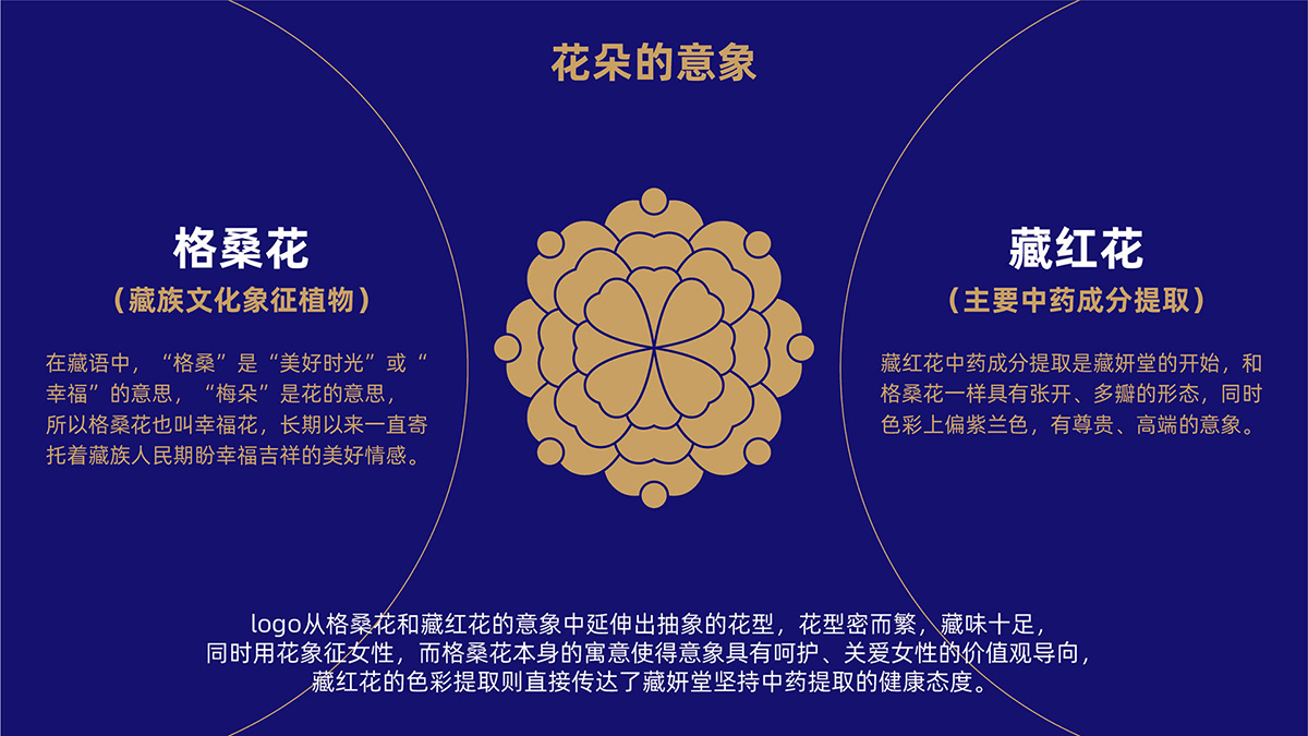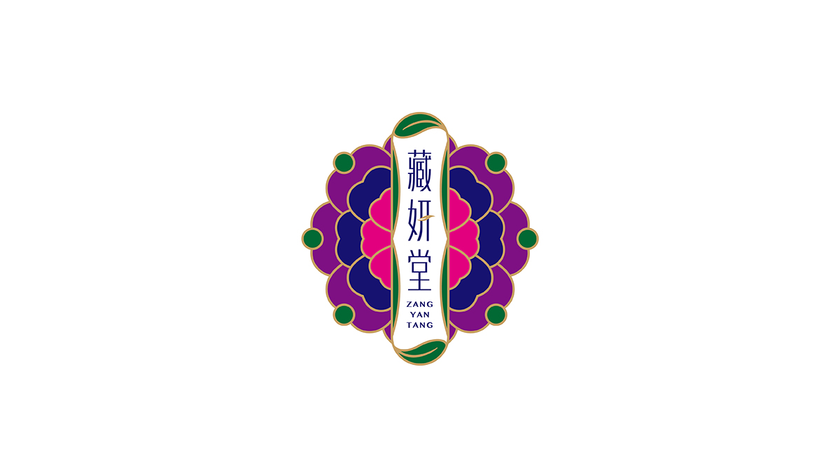 LOGO從格桑華和藏紅花的意向中延伸出抽象的花型,花型蜜而繁,藏味十足,同時(shí)用花象征女性,而格桑花本身的寓意使得意象具有呵護(hù)、關(guān)愛女性的價(jià)值觀導(dǎo)向,藏紅花的色彩提取則直接傳達(dá)了藏妍堂堅(jiān)持中藥提取的健康態(tài)度。