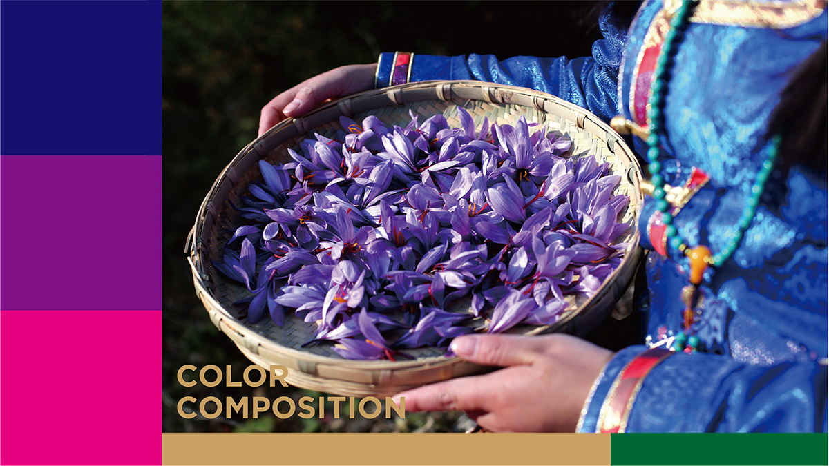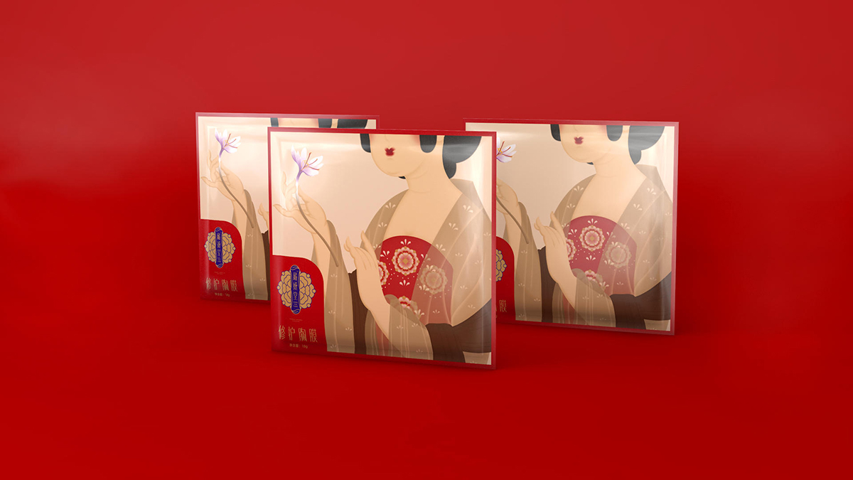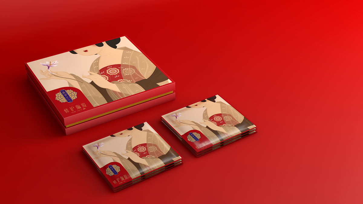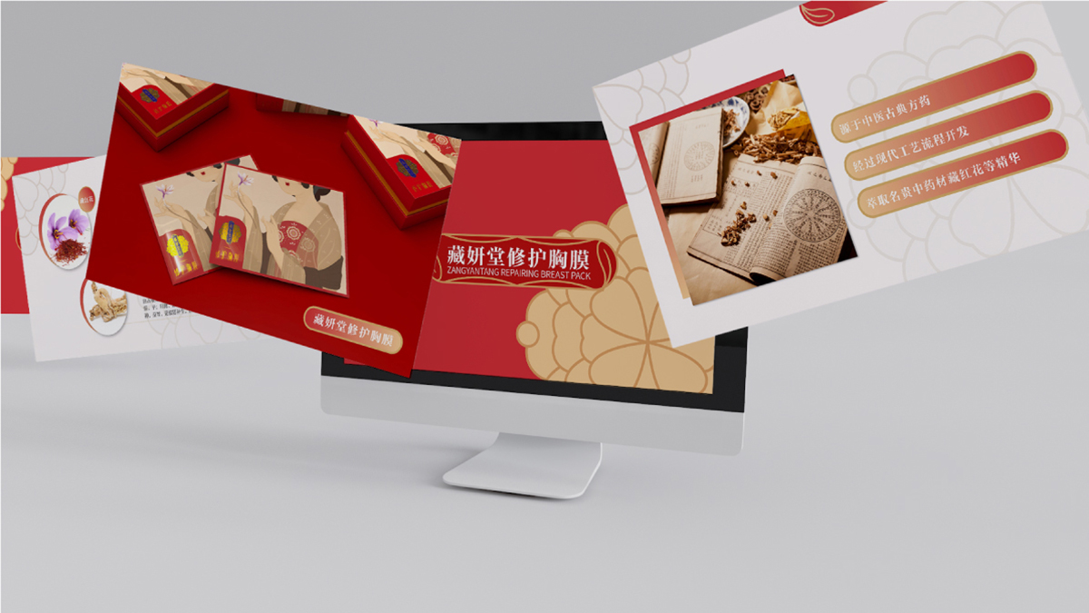 LOGO從格桑華和藏紅花的意向中延伸出抽象的花型,花型蜜而繁,藏味十足,同時(shí)用花象征女性,而格桑花本身的寓意使得意象具有呵護(hù)、關(guān)愛女性的價(jià)值觀導(dǎo)向,藏紅花的色彩提取則直接傳達(dá)了藏妍堂堅(jiān)持中藥提取的健康態(tài)度。