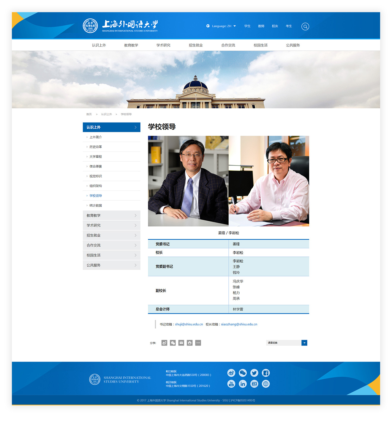 上海外國語大學(xué),簡稱“上外”、 “SISU”,是教育部直屬并與上海市共建、進(jìn)入國家“211工程”建設(shè)的全國重點(diǎn)大學(xué),秉承“格高志遠(yuǎn)、學(xué)貫中外”的校訓(xùn)精神,篳路藍(lán)縷,奮發(fā)有為,現(xiàn)已發(fā)展成一所培養(yǎng)高端國際型外語人才的多科性、國際化、高水平特色大學(xué),蜚聲海內(nèi)外。網(wǎng)站自適應(yīng)PC/手機(jī)/pad終端,真正實(shí)現(xiàn)了多屏互動。新版的上外外文站在全國眾多高校外文網(wǎng)站建設(shè)的大趨勢下起到了示范性作用,同時也極大的提升了上外在國際上的品牌形象。
