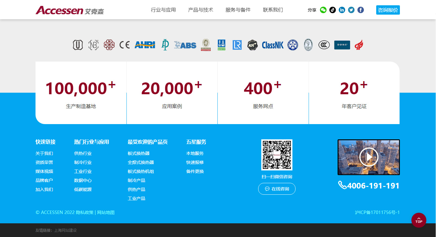 上海艾克森股份有限公司是專業從事換熱設備研發、制造、銷售及服務的換熱解決方案提供商,生產包括換熱器、板式換熱器、熱交換器、換熱站、換熱設備、板式換熱機組、全焊式換熱器、換熱機組、熱交換機組、脫硫系統換熱器、脫硝系統換熱器、制冷換熱器、空預器應用、生活熱水系統改造、工藝水冷卻系統、余熱回收系統改造在內的全系列節能換熱設備,同時也提供符合ASME、CE、API、JIS、IEC、DNV、GL、ABS、BV、CCS、GB等國際規范和標準的產品。