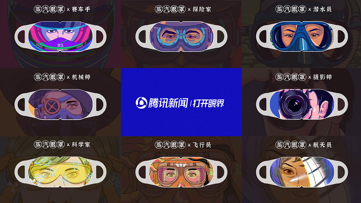 蒸汽眼罩整體設計風格采用帶有豐富色彩的賽博朋克風,以平面線條著色的繪畫風格,著重面部細節的刻畫和色彩表達,體現出不同職業的面部特性,與使用者有趣味性互動。