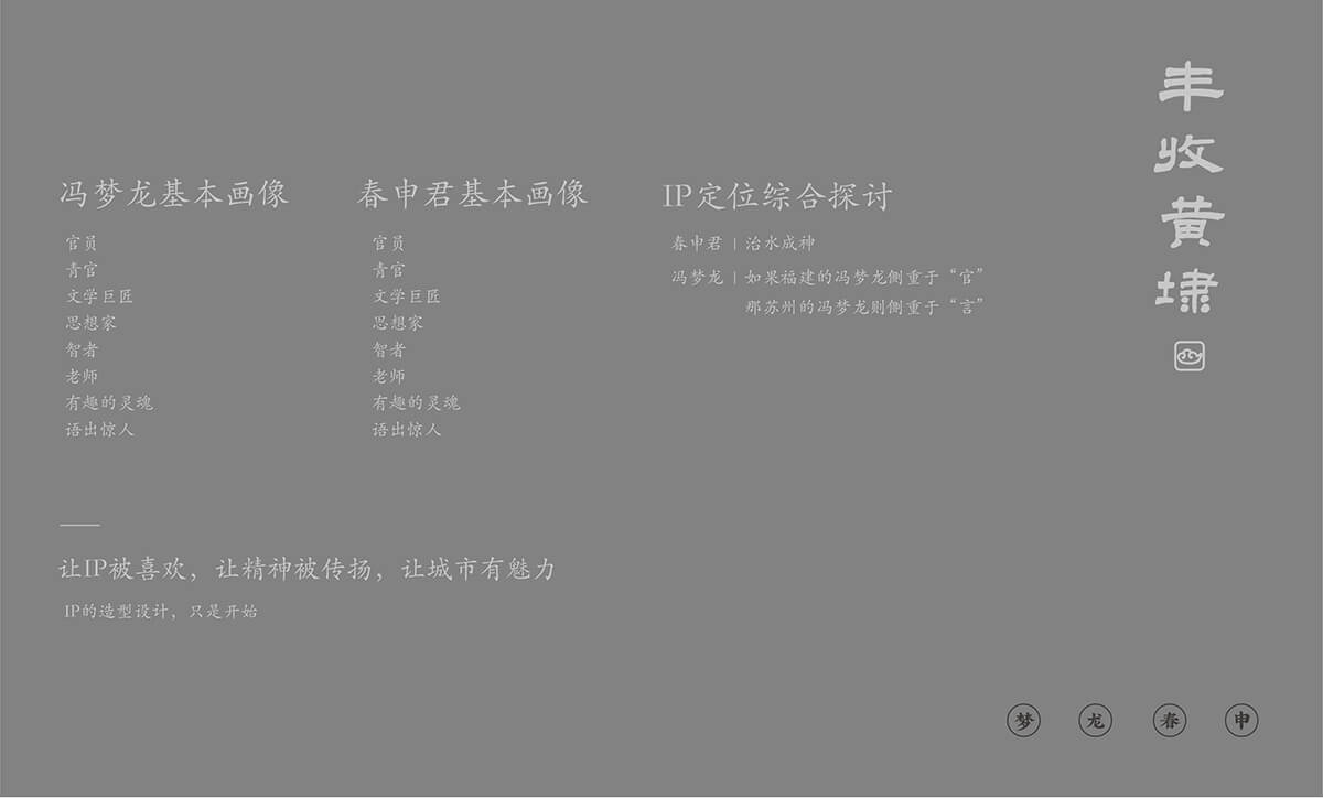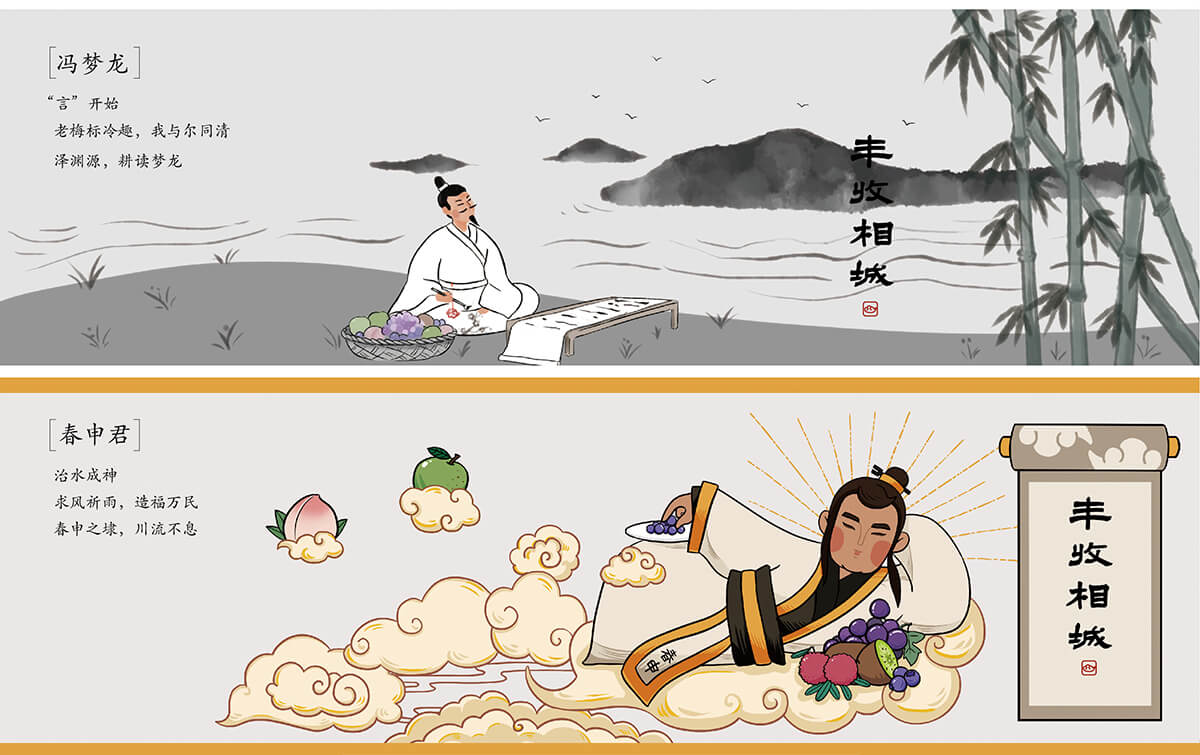 馮夢龍基本畫像:官員、清官、文學巨匠、智者、老師、語出驚人,“言”開始,老梅標冷趣,我與爾同清,澤淵源,耕讀夢龍。春申君基本畫像:治水成神,秋風祈雨,造福萬民,春申之埭,川流不息。