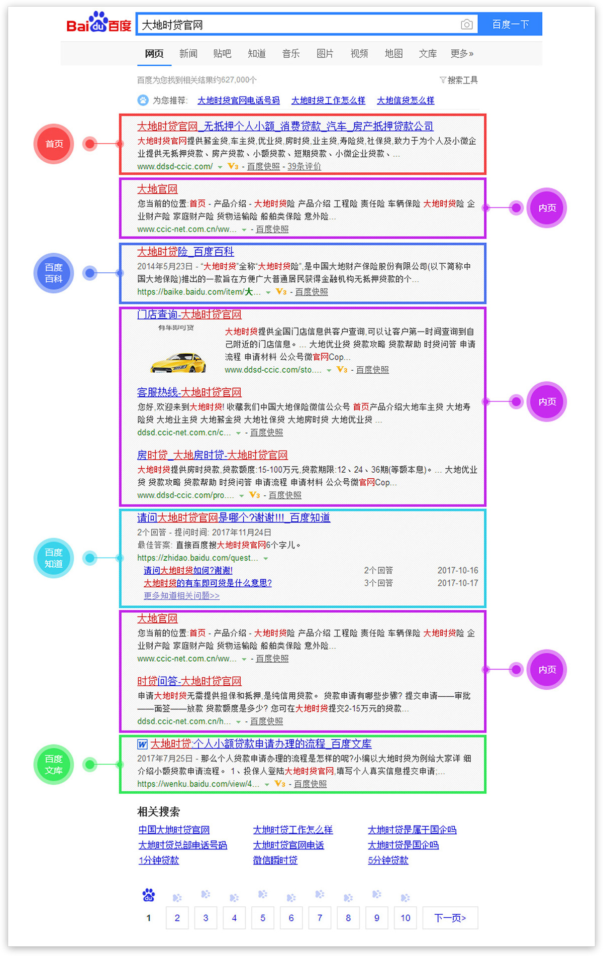 大地時貸網站在建設上線時臨時使用的是三級域名運營了一年的時間,后期公司長久規劃啟動一級域名來進行SEO優化操作。為了把一級域名優化至百度首頁壓制三級域名排位,首先選擇了品牌詞和產品詞進行優化。保證用戶在第一時間搜索品牌詞和產品詞可以看到自然排位的第一名就是大地時貸的官網。