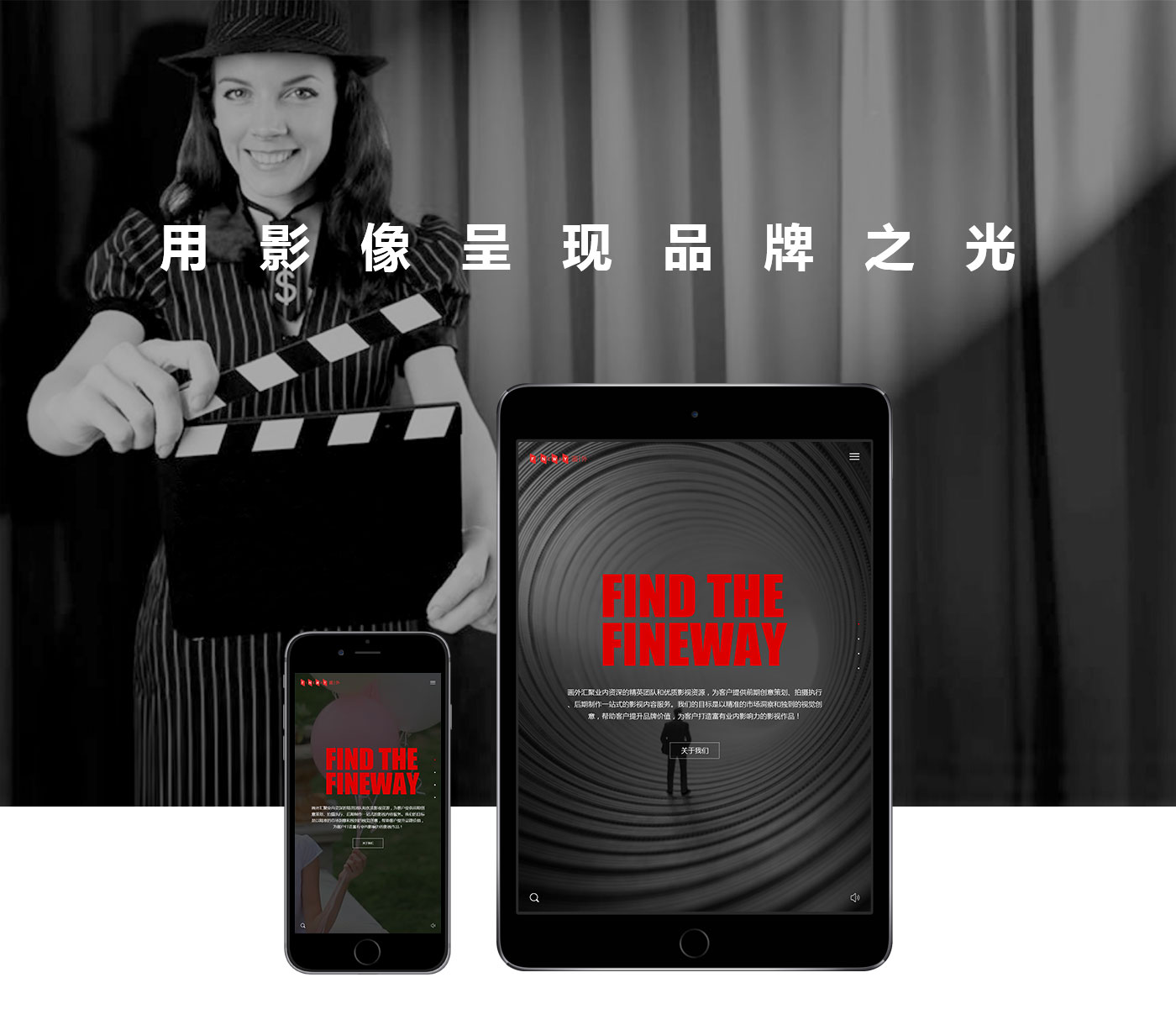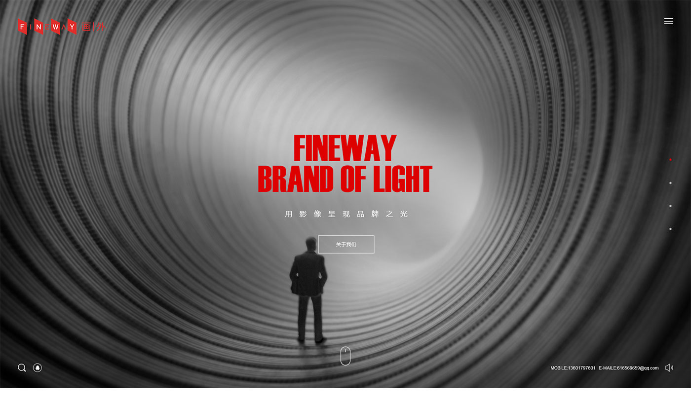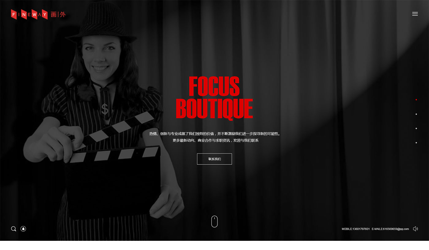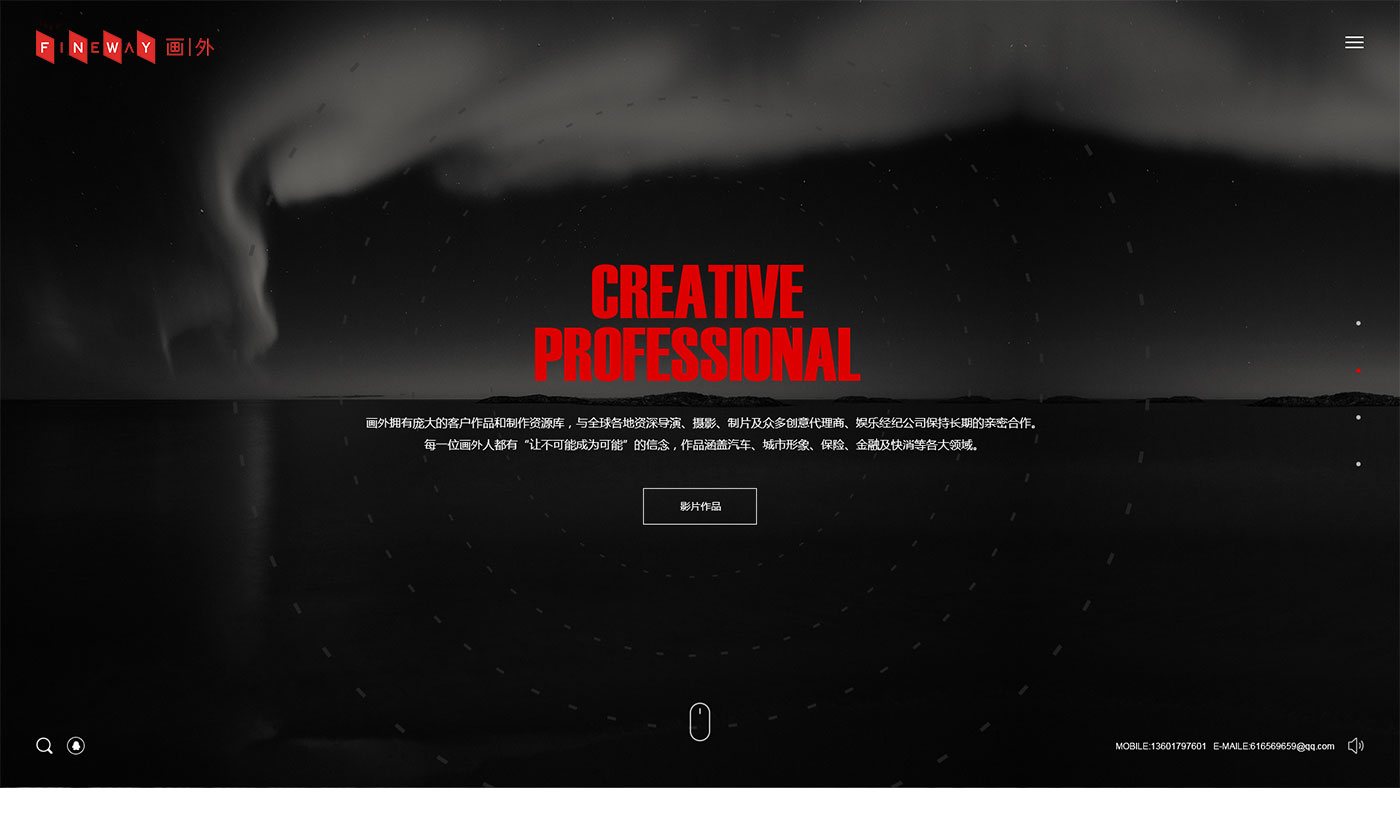 根據前期和客戶溝通和了解客戶公司現階段的需求,畫外網站首頁體現公司拍攝的案例精彩剪輯為網站背景。簡潔的文字對比,整體畫面簡潔明了重點突出經典的案例使整個網站根據動態感。