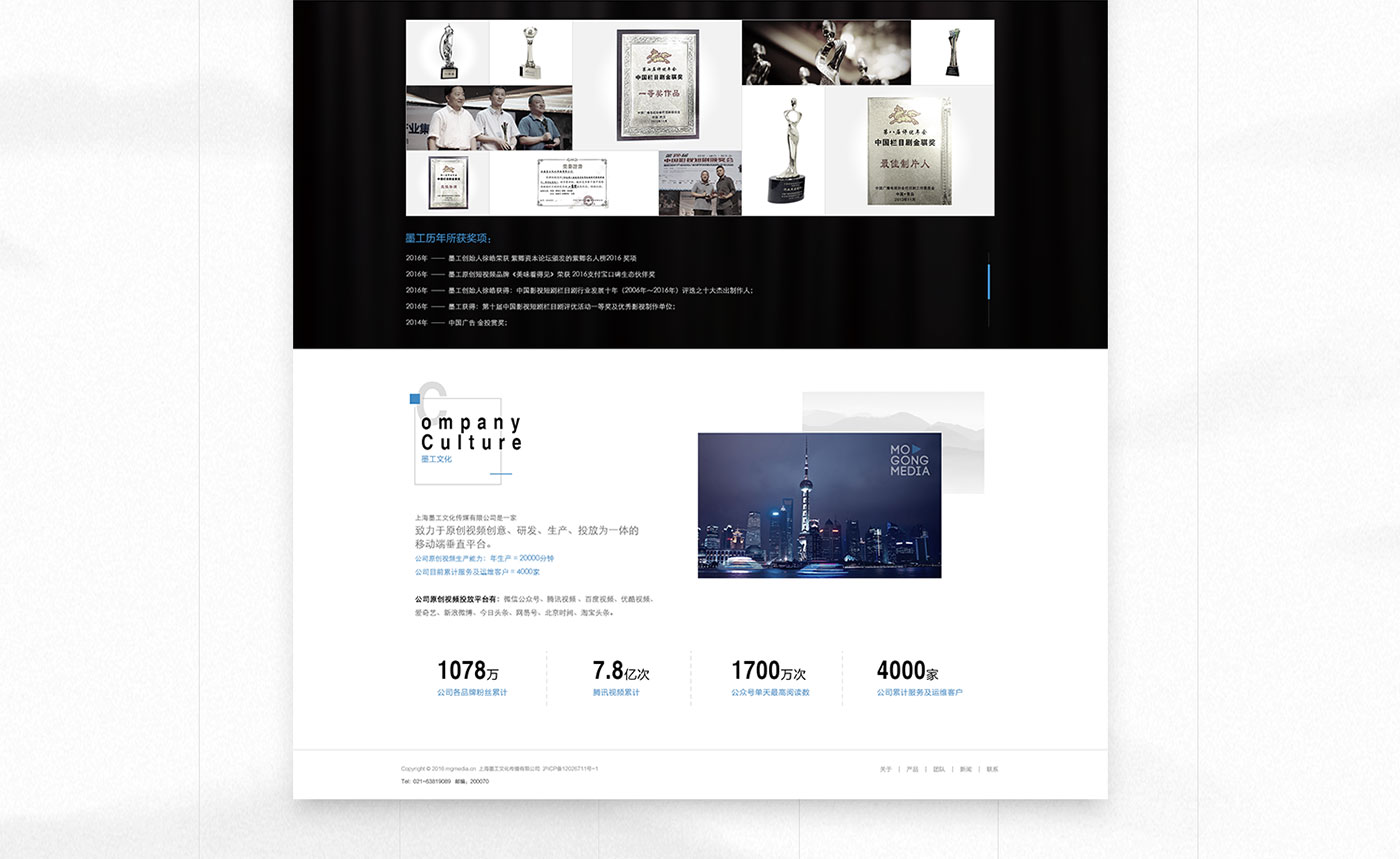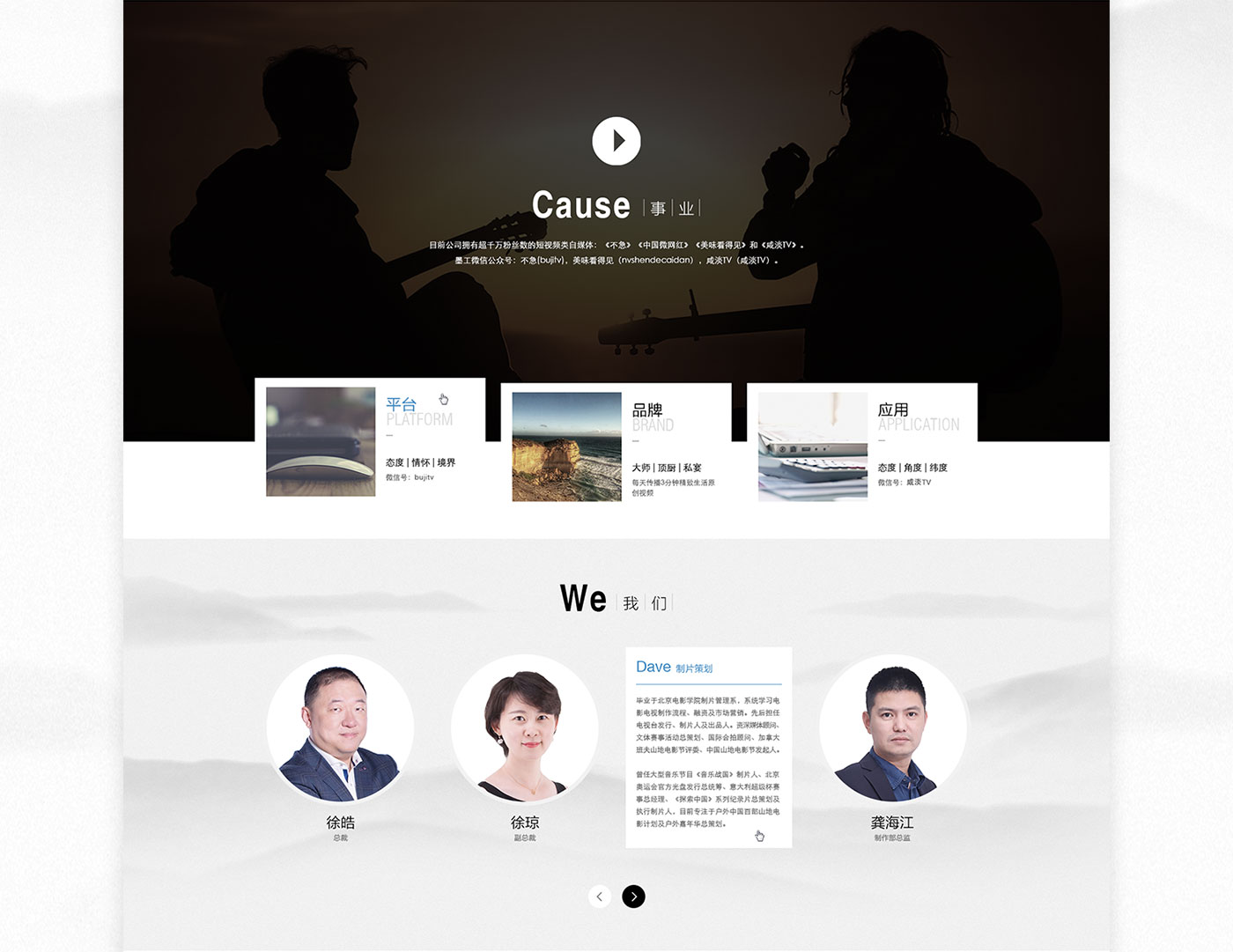 墨工文化傳播有限公司在短視頻拍攝、互聯(lián)網(wǎng)新媒體等領(lǐng)域有較深的造詣,有自營(yíng)短視頻“不急TV”、“中國(guó)微網(wǎng)紅”和“美味看得見(jiàn)”等品牌。在設(shè)計(jì)上追求簡(jiǎn)約,時(shí)尚,具有深層次的文化底蘊(yùn)的風(fēng)格;本次合作各個(gè)環(huán)節(jié),如網(wǎng)站設(shè)計(jì)、前端制作和后臺(tái)開(kāi)發(fā),客戶都能根據(jù)實(shí)際情況配合溝通并提出寶貴的建議。
