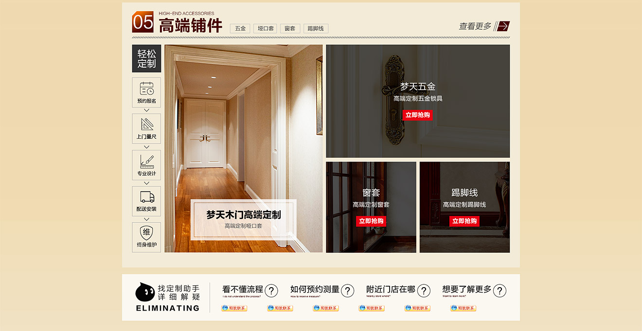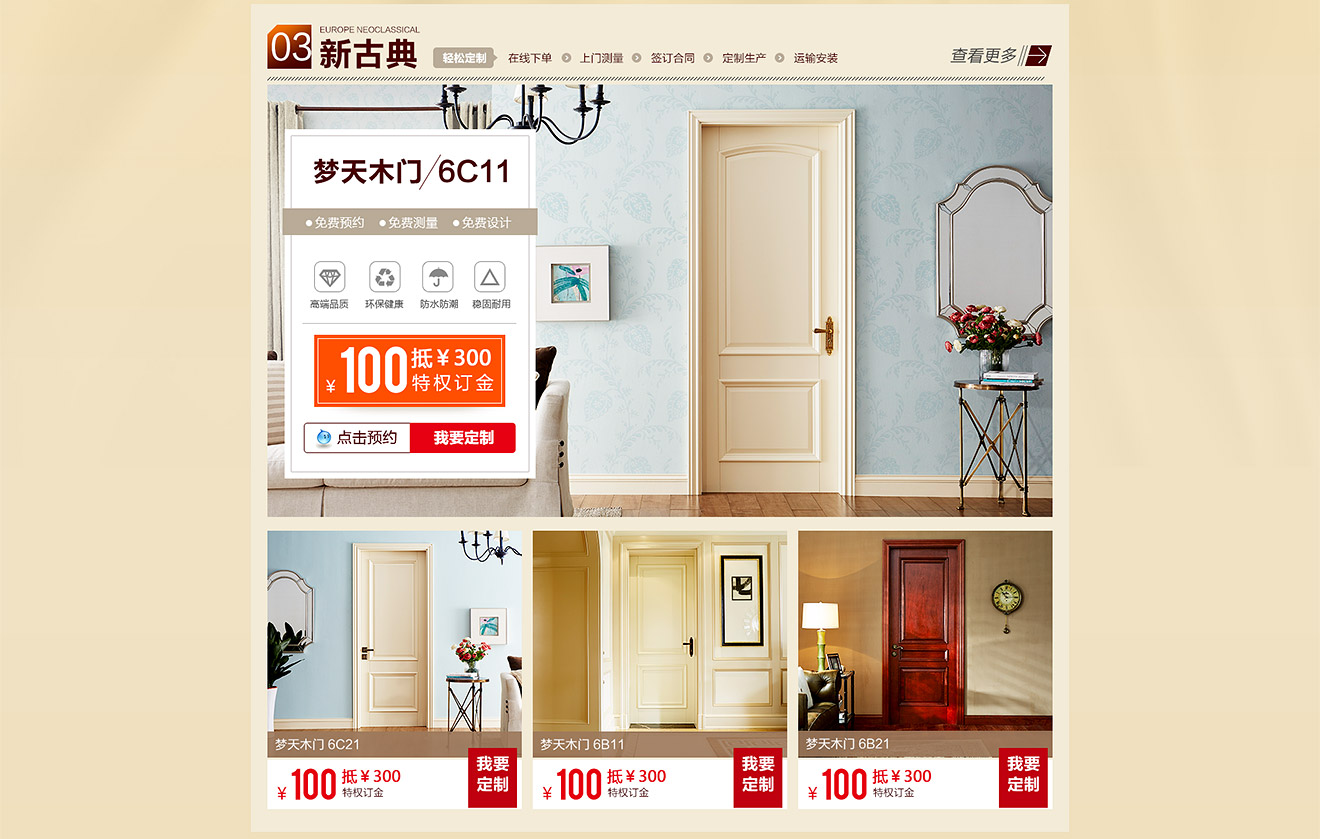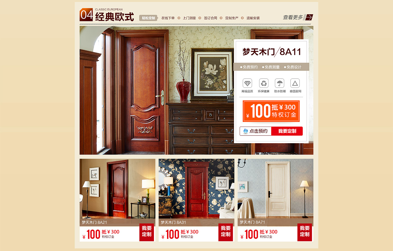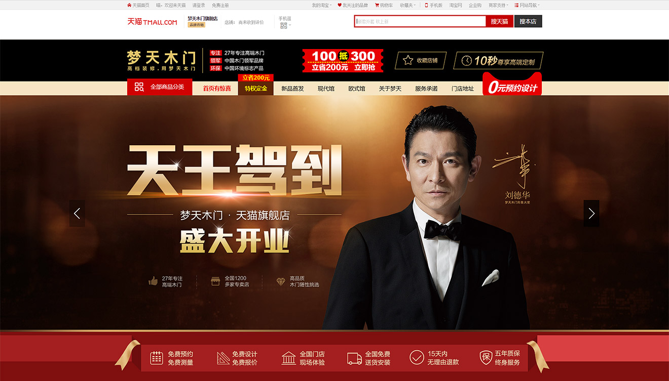 助騰服務于夢天木門天貓官方旗艦店,從無到有整個天貓店鋪的搭建,店鋪首頁到寶貝詳情和雙11活動的設計。 展示夢天木門的服務和高端木門的產品特色,店鋪突出夢天推出的特權定金及活動促進消費,提升夢天木門在群眾中高度門木的印象。